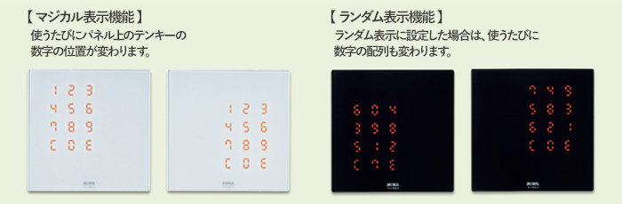 使うたびにパネル上のテンキーの数字の位置が変わる【マジカル表示機能】と、使うたびに数字の配列も変わる【ランダム表示機能】があり、防犯性と利便性の用途に応じた運用が可能です。パネル上の特定の場所が変色摩耗することもありません。